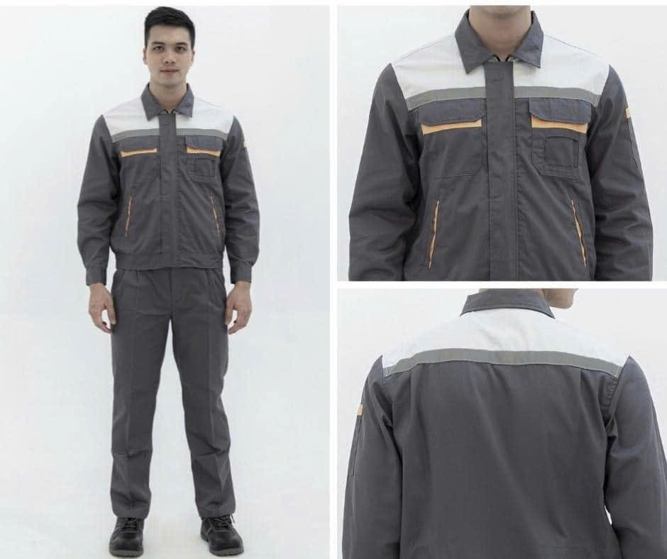 Đặc điểm áo: Bu rông cổ Đức, phối mầu ghi chì + cam + Phản quang